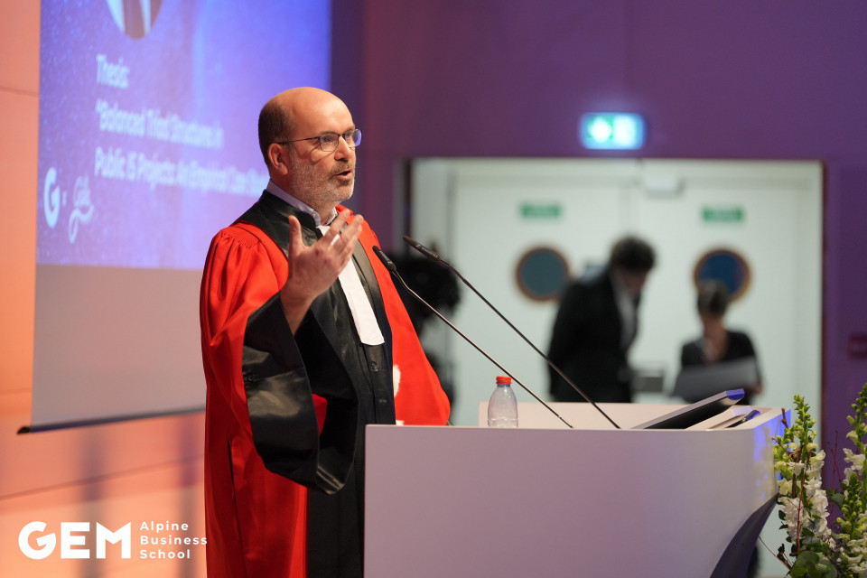 Le grand témoin alumni, Dr Thomas Quartier, DBA 2025, expert des transformations Lean Agile et DevOps à l'échelle contextualisées au secteur public - où il accompagne les organisations dans la création et l'exploitation de systèmes numériques complexes au service des citoyens - a partagé un message puissant sur l’impact de la recherche appliquée. Il a rappelé que le diplôme représente bien plus qu’une validation académique :