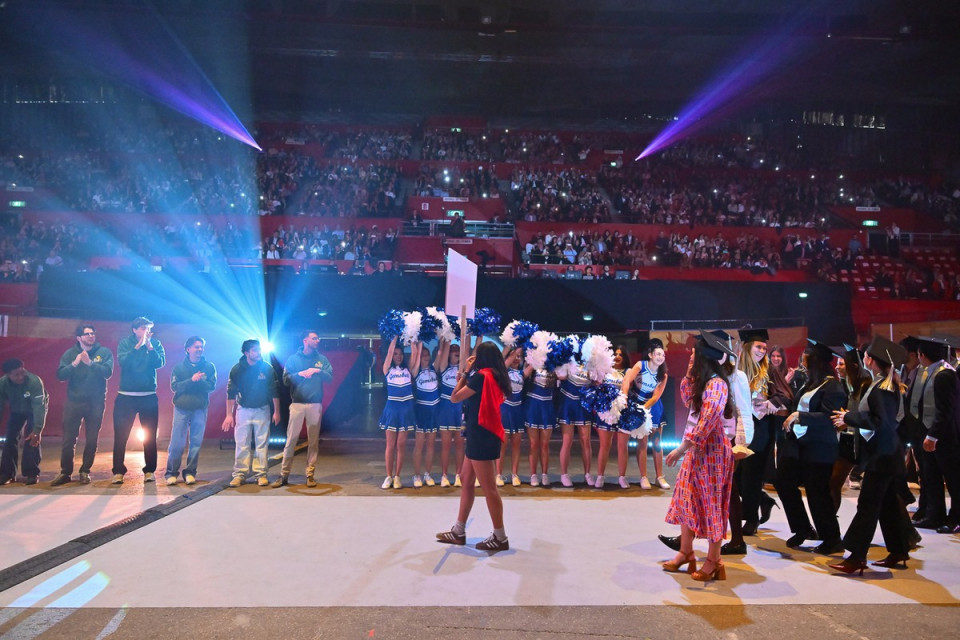 - un défilé des diplômés autour de la scène centrale en mode parade olympique,